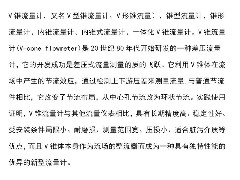 V型锥91黄瓜视频下载是差压式91黄瓜视频下载,也是一种通过节流取差压以反映流量大小的节流装置。节流件为一个悬挂在管道中央的锥形体,高压P1取自锥体前流体未扰动(即未形成节流,流体未加速)的管壁 ;低压P2取自后锥体中央,并通过引压管引至管外,它遵从基于封闭管道中能量相互守恒的伯努力原理:当管内流体流经管内正中锥体时,流体逐步被压缩,流速加快而动能增加,此增加的动能,经锥体直径最大处后逐步释放而在锥体后边产生一个低压带(相对于管道压力),从而建立了流量与其流经V形锥前后所产生的差压△P的平方根成正比。计算与孔板、喷咀等类似。