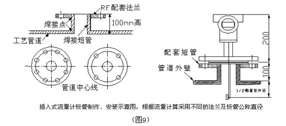 h、插入式91黄瓜视频下载安装时,将短管及法兰焊到管道上时必须确保流体正对着靶片受力面,焊接短管高度在100mm(从管道内壁至法兰密封面的距离);(图9)